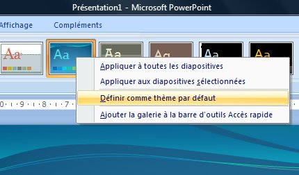 Pour faire de votre modèle un modèle par défaut, cliquez sur le modèle en question avec un clic droit et choisissez : Pour toutes les nouvelles présentations.
